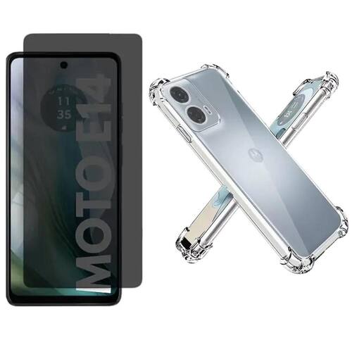 Capa Moto E14 + Película de Privacidade 3D - Armyshield oferece uma proteção completa para o seu smartphone, combinando uma capa resistente e uma película de vidro 3D com filtro de privacidade. A capa protege contra quedas e arranhões, enquanto a película impede a visualização da tela de ângulos laterais, mantendo suas informações privadas.