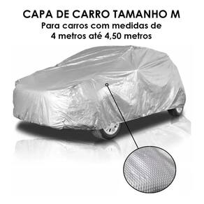 Capa Carro Proteção Tamanho M Impermeável Com Forro Central Cinza Media Capa de carro com forração central Tamanho médio para carros com medidas de 4 metros até 4,50 metros Descriçao: A capa para carro é essencial para quem tem mais de um carro na garagem ou tem apenas um carro e só usa nos fins de semana, já que o trânsito das cidades está a cada dia mais caótico. Com a capa automotiva seu carro poderá ficar protegido dos danos da chuva, chuva ácida, sol, poeira, neblina, riscos e arranhões. A capa com forro inclui uma proteção extra contra o sol e chuva, podendo ser Utilizado em garagem coberta ou descoberta. As capas automotivas são fabricadas em polietileno trançado peva que possui proteção u.V que é um material térmico e tem a cor prata que ajuda a dissipar o calor, elas tem proteção interna de polipropileno que possui um tratamento anti-risco, ideais para pessoas que moram em apartamentos, condomínios ou deixam o carro em estacionamentos de terceiros que são lugares com maior índice de por atos de vandalismo. As capas para carro possuem sistema interno de ventilação que faz com que o ar circule embaixo da capa, para evitar que fique umidade entre a capa e a pintura do carro, são super resistente e anti-mofo, leves de fácil manuseio e transporte, pois qualquer pessoa pode colocar e retirar a capa a qualquer hora sem nenhum esforço. Fabricado em polietileno. Cor prata. Especificações técnicas Tamanho: m Comprimento: 4,50m Largura: 4,06m Conteúdo da embalagem 1 capa para carro classic tamanho m. 1 manual de instruções. Aplicação Capa em tamanho m para veículos de 4,06 até 4,50 metros Modelos de exemplo: Montadora: fiat Modelo: elba, panorama, prêmio, tempra, tipo, fiorino, palio weekend, siena, stilo, marea, brava, strada, idea aventure. Montadora: volkswagen Modelo: brasília, golf, voyage, apollo, saveiro, logus, passat, bora, polo sedan, polo hatch, parati, new beetle, cross fox, space fox. Montadora: gm Modelo: monza, vectra modelo do ano 1995 até 2005, classic, corsa sedan, corsa wagoon, pick-up corsa, montana, prisma, ipanema, kadett, chevy, chevette, astra hatch, astra sedan, astra perua, vectra gt, meriva. Montadora: ford Modelo: fiesta sedan, focus hatch, focus sedan, courier, vernoa, belina, del rey, pampa, escort novo, corcel. Montadora: renault Modelo: clio sedan, renault 19, megane. Montadora: peugeot Modelo: 307, 307 sedan, 406. Montadora: importados Modelo: new civic, acord, corolla, fielder, camry, alfa romeo, audi a4, c4, pallas, c5, bmw 528, mercedes e , mercedes c. Manutenção e cuidados especiais estão impressos na etiqueta fixada na parte interna da capa. Atenção: a capa não poderá ser Utilizado quando: a pintura do carro apresentar falta de brilho, falta de verniz, manchas e fundo aparente. Caso a pintura se encontrem qualquer destas condições citadas poderá provocar manchas esbranquiçadas em quase 100% dos carros. Obs: o fabricante se isenta de qualquer dano se o usuário descumprir estas orientações. - 3 meses A empresa não se responsabiliza pela má instalação do produto. Procure por um profissional especializado