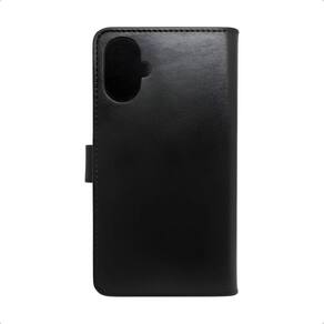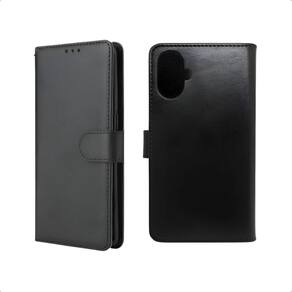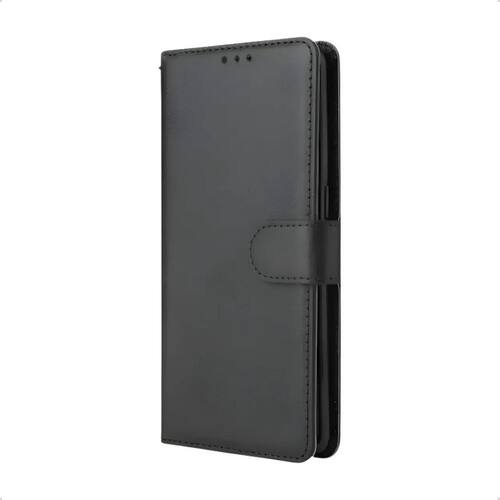 Capa tipo carteira com proteção completa, compartimentos internos para cartões e dinheiro, fechamento magnético e função suporte para vídeos.