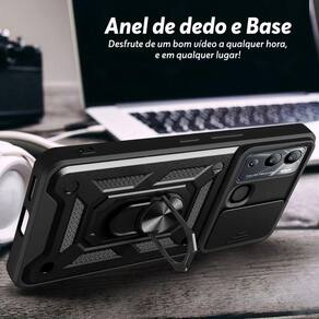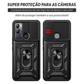 Especificações técnicas: - Material: TPU e policarbonato - Cor: preta - Proteção anti impacto de dupla camada - Anel de dedo e metal embutido para aderir em imã - Anel ajustável para função de base - Encaixe 100% perfeito - Slide cover para proteção das câmeras e privacidade - Compatível apenas com o modelo Infinix Hot 12I Marca: Não Informado