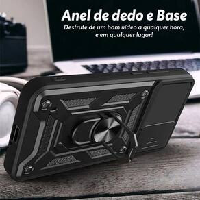 4. Essa capa possui algum diferencial? Sim, essa capa possui um relevo na parte que protege a câmera, um anel de dedo e metal embutido para aderir em imã, além de um slide cover para maior proteção das câmeras e privacidade.