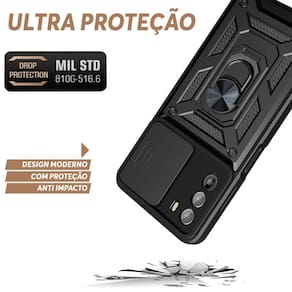 A capa possui um ótimo acabamento com alto relevo na parte que protege a câmera, proporcionando uma proteção extra para esse componente tão importante. Além disso, ela possui dupla resistência, com uma proteção anti impacto de dupla camada, garantindo uma proteção ainda maior para o seu smartphone.