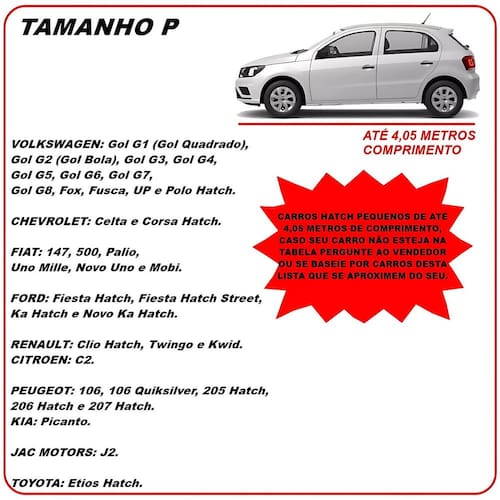 Conteúdo da Embalagem 01 Capa Automotiva Semi Forrada Impermeável (escolha o tamanho conforme seu veículo) 01 Bolsa para armazenamento (compacta e resistente)