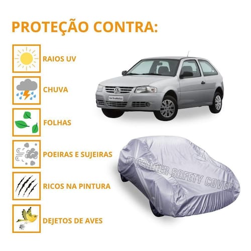 A capa de cobrir carro gol mosaner safety cover possui ótima qualidade que proteje seu veículo de diversas formas, como contra chuvas, sujeira, poeira, sereno, dejetos de aves, seiva e resíduos de árvores como folhas, fuligem, maresia, poluentes, respingos de tinta, arranhões superficiais e raios solares.