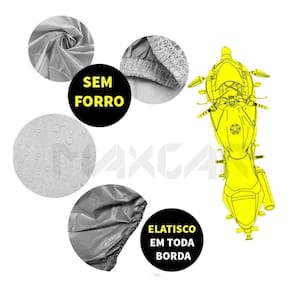 Capa para Cobrir Motocicleta 100% Impermeável e sem forro, protege contra sol, chuva , poeira, risco e sujeira de animais ou aves. Ideal para quem quer conservar a pintura da sua moto. Nas borda da capa possui elásticos que deixa a capa bem presa a moto. Fabricada com material de alta qualidade que oferece maior resistência e durabilidade, impede qualquer tipo de dano na pintura. Para escolher o tamanho ideal para sua moto, siga a tabela de medidas que se encontra nas fotos do anuncio.