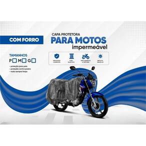 Capa Cobrir Moto Tamanho P com Forro A Capa Protetora para Moto Com Forro Tamanho P é a solução ideal para proteger sua motocicleta contra diversos elementos climáticos e sujeiras. Fabricada com materiais de alta qualidade, esta capa oferece proteção completa contra chuva, poeira, raios UV e muito mais, mantendo sua moto sempre limpa e com a pintura preservada. Especificações do Produto: Modelo: Capa Protetora para Moto Impermeável Com Forro Material: Material Impermeável de Alta Qualidade com Forro Tamanho: P para motos pequenas Peso Aproximado: 1 kg Itens Inclusos na Embalagem: 1 Capa Protetora para Moto Tamanho P Características: Proteção Completa: Protege a moto contra chuva, poeira, raios UV, folhas e excrementos de pássaros. Material Impermeável: Garante que a água não penetre, mantendo a moto seca. Resistente ao Sol: Protege a pintura da moto contra os raios UV, evitando desbotamento. Durabilidade: Feita com materiais de alta qualidade para maior durabilidade. Ajuste Perfeito: Equipada com elásticos ou cordões ajustáveis para garantir um ajuste firme, mesmo em dias de vento. Ventilação: Possui aberturas para ventilação, evitando a formação de mofo e bolor. Proteção para Pets: Evita arranhões e danos causados por animais de estimação. Não Danifica a Pintura: Material suave que não risca a pintura da moto. Reflete Raios UV: Protege a moto contra os danos causados pelo sol. Modelos Compatíveis Tamanho P : Dafra: Citycom 100, Kansas 150, Speed150, Super 50/100, Zig, Apache 150, Smart 125 Honda: Biz, CBX200/250, CG 125/150 Titan, CG125/150, CG125 Cargo, Lead 110, Pop 100 Sundown: Future, Future Sport, Hunter, Hunter 100, Max SE/SED, Motard 125 CC, Web, Web Evo Suzuki: Burgman, Intruder 125 ED/Cargo, Yes 125 ED/Cargo : Crypton, Factor YBR 125, Factor YS 250, Neo, YBR 125 Como Usar: Escolha o Tamanho Correto: Verifique as dimensões da sua moto e escolha uma capa que se ajuste bem a ela. Colocação: Comece pela parte dianteira da moto e vá estendendo a capa até cobrir completamente. Ajuste: Certifique-se de que todos os lados estejam bem ajustados e que os elásticos ou cordões estejam bem presos. Remoção: Retire a capa começando pela parte traseira e dobre-a cuidadosamente para armazenamento. Dicas de Manutenção: Limpeza: Lave a capa periodicamente com água e sabão neutro para mantê-la limpa e livre de odores. Armazenamento: Guarde a capa em um local seco e longe da luz solar direta quando não estiver em uso para preservar sua durabilidade. Transforme a proteção da sua moto com a Capa Protetora para Moto Com Forro Tamanho P e mantenha seu veículo sempre em ótimo estado Destaques do Produto Proteção completa contra intempéries e sujeiras Material impermeável e resistente ao sol Ajuste perfeito para motos pequenas Fácil de colocar e remover Versatilidade para uso interno e externo Durabilidade e alta qualidade Ideal para motos como Honda Biz, CG 125, YBR 125 e outras