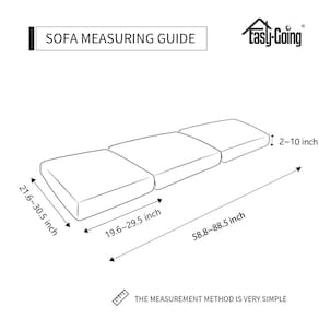 Fabricante profissional de capa de sofá Easy-Going global! Nosso objetivo é tornar a vida mais confortável e conveniente. Material macio: materiais de alta qualidade e confortáveis. Utilidade: dá uma aparência fresca e confortável enquanto protege os móveis contra manchas, desgaste. Fácil de instalar: basta colocá-lo na almofada. Recomendações: 1. Lavável na máquina. Lavar separadamente no ciclo delicado. Usando detergente suave para a roupa. Secar na secadora com temperatura baixa. Não usar alvejante. 2. Devido a diferentes monitores de computador/tela, a cor do produto pode ser um pouco diferente da imagem. Como estamos fazendo nossos produtos manualmente, pode haver um desvio de cerca de 2 cm. - Material de alta qualidade: 80% poliéster + 20% elastano, tecido elástico de alta qualidade, macio e confortável. Ter uma capa de almofada protege seu sofá de derramamentos e manchas. - Dimensões: almofada de sofá de 3 peças: comprimento 149-224,8 cm, largura 55-77,5 cm, espessura 5-25,4 cm. Para obter mais detalhes, consulte o guia de medidas na foto, meça antes de comprar. - Amplo uso: você pode usá-lo para cobrir não apenas as almofadas de assento do seu sofá, mas também as almofadas traseiras, desde que possam ser separadas do sofá. são preparadas, você pode escolher a cor que deseja cobrir. - Fácil de instalar: verifique o guia de instalação cuidadosamente, ele pode ser finalizado em 3 minutos por uma pessoa, fornecendo proteção total. Você não precisa ajustar depois de sentar. Embalagem: 3 capas de almofada. - Fácil de cuidar: lavável na máquina, lavar em temperatura de cerca de 30 graus Celsius, recomenda-se lavar detergentes neutros, não usar alvejante, não passar a ferro.