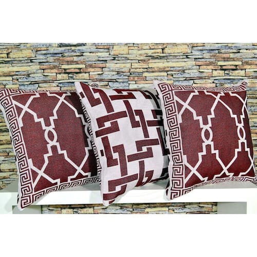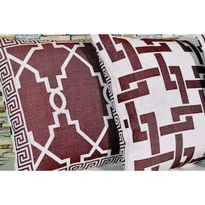 Linda capa de almofada em tecido jacquard rústico dupla face, nas cores vinho e cru, com detalhes em desenhos geometricos.