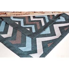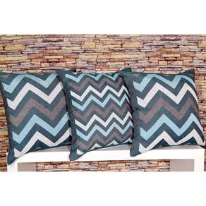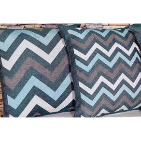 Linda capa de almofada em tecido jacquard rústico dupla face, nas cores verde, cinza e cru, com detalhes de desenhos em zig zag.
