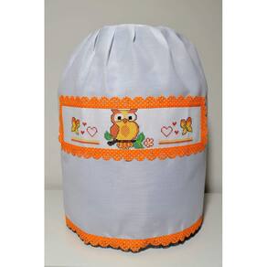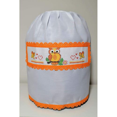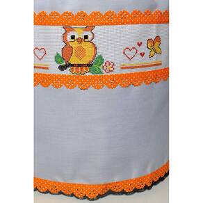 Capa confeccionada em tecido tergal na cor branco, com barrado bordado em ponto cruz de coruja, borboletas e flores, nas cores vermelho, preto, amarelo, laranja e verde, acabamento em laise na cor laranja de bolinha.