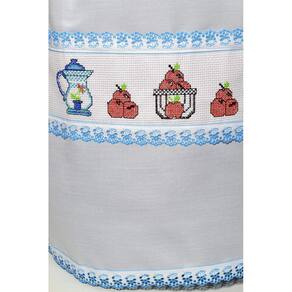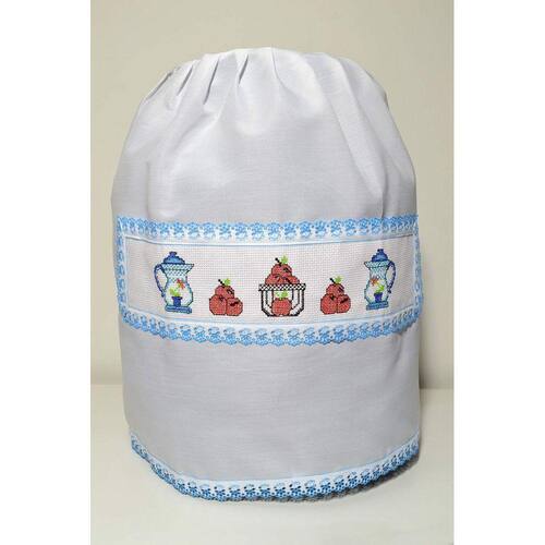 Capa confeccionada em tecido tergal na cor branco, com barrado bordado em ponto cruz de jarras e frutas, nas cores azul, vermelho, preto, verde, amarelo e acabamento em laise na cor azul.