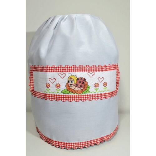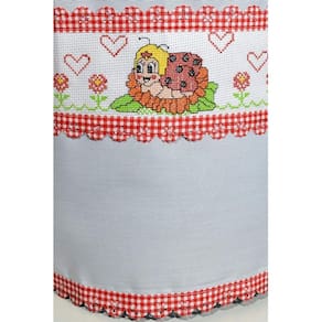 Capa confeccionada em tecido tergal na cor branco, com barrado bordado em ponto cruz de uma linda joaninha no jardim, nas cores vermelho, preto, bege, amarelo e acabamento em laise na cor xadrez vermelho.