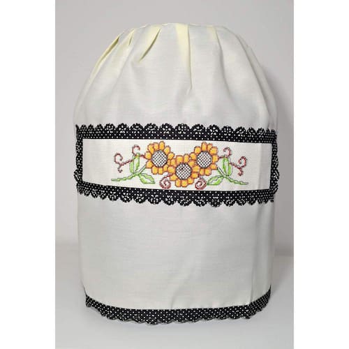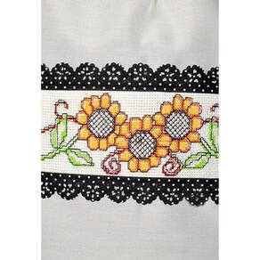 Capa confeccionada em tecido tergal na cor palha, com barrado bordado em ponto cruz de girassol, nas cores preto, amarelo, laranja e verde e acabamento em laise na cor preto de bolinha.