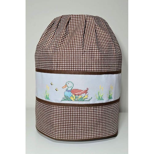Capa confeccionada em tecido xadrez marrom, om um lindo barrado branco bordado em ponto cruz de um patinho, borboletas e flores nas cores vermelho, verde, amarelo, azul e marrom, detalhes em viés na cor marrom.