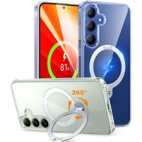 - Anel versátil 3 em 1: não apenas um suporte, mas o anel também integra carregamento e suporte de anel, tudo de uma vez. Se você prefere uma configuração vertical para chamadas de vídeo ou uma orientação horizontal para programas de TV, esta capa S25 Plus com suporte tem o que você precisa. Funciona como um prático suporte de anel para você prender quando suas mãos estiverem cheias, permitindo um manuseio sem esforço com um dedo. O suporte de liga de zinco altamente condutor permite carregamento rápido com facilidade