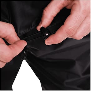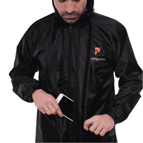 Conjunto de nylon com o melhor custo-benefício. A jaqueta conta com fechamento através de zíper e velcro recobertos por uma lapela de drenagem, gola alta, bolso interno em zíper, regulador velcro nos punhos, detalhes em viés prata (rosa no feminino), cinto regulador de cintura (no feminino), viés refletivo + “P” refletivo nas costas. A calça conta com elástico na cintura e regulador em zíper com viés refletivo.