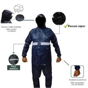 Proteção total - Jaqueta com capuz e calça 100% impermeáveis. Resistência e conforto - Produzido em PVC e poliéster de alta qualidade. Segurança reforçada - Faixa refletiva para melhor visibilidade à noite. Ajuste seguro - Elástico nas mangas e proteção extra no zíper. Fácil de transportar - Acompanha bolsinha compacta para guardar o conjunto.