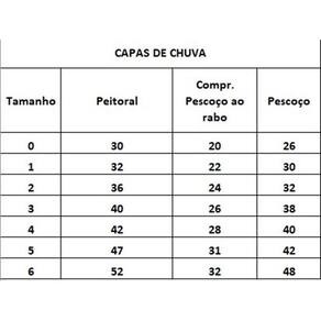 Tabela de tamanhos: - Tamanho 01: comprimento das costas - 20cm / largura do peitoral - 30cm - Tamanho 02: comprimento das costas - 25cm / largura do peitoral - 35cm - Tamanho 03: comprimento das costas - 30cm / largura do peitoral - 40cm - Tamanho 04: comprimento das costas - 35cm / largura do peitoral - 45cm - Tamanho 05: comprimento das costas - 40cm / largura do peitoral - 50cm - Tamanho 06: comprimento das costas - 45cm / largura do peitoral - 55cm - Tamanho 07: comprimento das costas - 50cm / largura do peitoral - 60cm