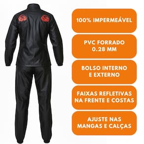 Informações técnicas Marca: Brascamp Modelo: Moto Race Feminino Material: Cilontex tb (confort) Composição: PVC forrado, Poliéster Faixa refletiva Bolso interno e externo Ajustes nas mangas e calças CA 28481 (Blusão) CA 28482 (Calça)