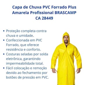 A capa de segurança é ideal para profissionais que necessitam de proteção completa contra umidade e chuva em ambientes de trabalho. Confeccionada em tecido sintético plastificado em PVC com forro, a vestimenta possui costuras através de solda eletrônica, garantindo máxima impermeabilidade e durabilidade. Benefícios