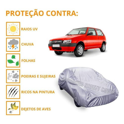 A capa de cobrir carro fiat uno mille mosaner safety cover possui ótima qualidade que proteje seu veículo de diversas formas, como contra chuvas, sujeira, poeira, sereno, dejetos de aves, seiva e resíduos de árvores como folhas, fuligem, maresia, poluentes, respingos de tinta, arranhões superficiais e raios solares.