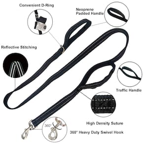 “Temos três tamanhos de coleiras para você escolher: 4 pés, 5 pés e 6 pés. A coleira de 4 pés é perfeita para cães pequenos e médios, como esquimós, pugs, border terriers, yorkies, huskies, corgis, chihuahuas, beagles e muitos mais! A coleira de 5 e 6 pés é perfeita para cães de médio e grande porte, como Pitbulls, Mastiffs Tibetanos, Weimaraners, Pomeranians, Bolzos, Labradores, Bulldogs e muitos mais! Também é ótimo para Doberman Pinschers de médio e grande porte e muitos outros. Fabricamos essas coleiras em náilon de alta qualidade, que é forte e durável. Reforçamos a costura na alça, na fixação do anel D e nas juntas de cada peça com uma técnica de costura cruzada, para que não quebre mesmo após um forte puxão e possa ser usada por um longo período de tempo. As alças duplas são projetadas ergonomicamente para melhor controle do cão. A alça acolchoada padrão é ótima para caminhadas casuais, enquanto a segunda alça acolchoada de trânsito é perfeita para treinamento de controle e segurança. O acolchoamento na parte interna da alça é mais largo para uma pegada mais macia, então você não precisa se preocupar em estrangular a mão, mesmo em caso de emergência. Adicionamos costuras refletivas à coleira do cão para ajudar você e seu cão a ficarem seguros e visíveis à noite. A costura é tão brilhante e visível nos faróis dos carros que você pode atravessar a rua ou caminhar pela rua com confiança. Esta coleira é a solução perfeita para donos de cães que desejam manter as mãos livres enquanto passeiam com o cachorro. O anel em D ampliado e espesso permite que você coloque sacos de cocô ou outros acessórios com facilidade, dando a você mais liberdade para passear com seu cachorro. É adequado para donos de cães de todas as raças e tamanhos, o que o torna uma ótima opção para todos. Se você está em busca de uma coleira multifuncional de alto nível para cães, não procure mais, esta coleira refletiva de náilon de alça dupla para cães com argola em D! É perfeito para você e seu amigo peludo!”