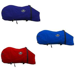 Fabricada em nylon balístico, forro de manta macia, meia argola em aço com banho cromo, fitas de nylon, proteção na altura da cernelha. Fechada na frente com alças de nylon e fivelas para regulagem, alças presas entre as pernas traseiras para não virar e por baixo na posição das barrigueiras. Usadas para aquecer o cavalo manter o pêlo liso em dias mais frios. Ean: 7908358326533