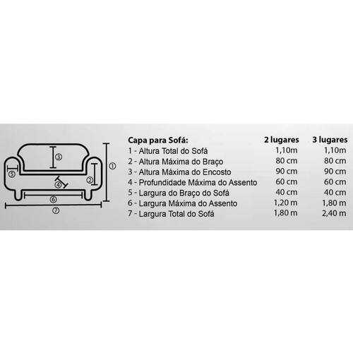 Medidas: 03 lugares 1. Altura total do sofá: 1,10 m 2. Altura máxima do braço: 80 cm 3. Altura máxima do encosto: 90 cm 4. Profundidade máxima do assento: 60 cm 5. Largura do braço do sofá: 40 cm 6. Largura máxima do assento: 1,80 m 7. Largura total do sofá: 2,40 m