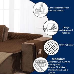 Capa De Sofá Retrátil 2,40m Dupla Face Matelada Com Bolsos Variação: Cáqui e Marrom Seja bem-vindo à Atual Ecommerce - há mais de 4 anos transformando lares no Marketplace Apresentamos a Capa Protetora de Sofá Retrátil Assento 2,40m Dupla Face, feita para quem quer praticidade, conforto e sofisticação no dia a dia. Você tem um sofá retrátil lindo, mas sofre com manchas, pelos ou desgaste constante Esse protetor é a solução perfeita: une estilo e proteção em um só produto, com excelente custo-benefício. Por que clientes amam essa capa transformei meu sofá sem gastar com reforma É prática, se ajusta certinho e ainda tem bolsos que facilitam a organização uso o lado escuro no dia a dia e o claro quando recebo visitas. Perfeita Especificações Técnicas: Modelo: Retrátil Dupla Face Medida do assento: 2,40 m duas partes de 1,20 m cada Dimensão total com braços: 4,20 x 2,40 m Tecido: 100% Poliéster Enchimento: 100% Poliéster Design: Matelado em losangos com acabamento em viés Lavável em máquina no modo delicado Bolsos em um dos braços em ambos os lados da capa de 3 meses contra defeitos de fabricação. Mais segurança e tranquilidade na sua compra Características do produto: Matelado em linhas elegantes Dupla Face com duas cores Confeccionado em 2 partes Bolsos porta-objetos Ajuste ideal para sofás retráteis grandes Características técnicas do produto: Tecido Superior/Inferior: 100% Poliéster Enchimento: 100% Poliéster Medidas: 2 partes de 1,20 x 2,40 m + 2 braços de 50 x 90 cm Acabamento em viés Lavável à máquina Você receberá: 1 Capa Protetora de Sofá Retrátil Assento 2,40m Dupla Face com bolsos. Agradecemos a sua visita à Atual Ecommerce. Conte com a gente para cuidar do seu lar Marca: Não Informado Ean: 7908736639613