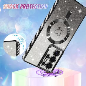 Capa com glitter, design magnético, proteção da câmera e compatibilidade com Magsafe.Acabamento do material