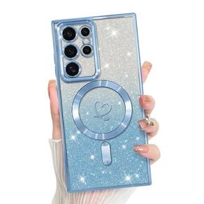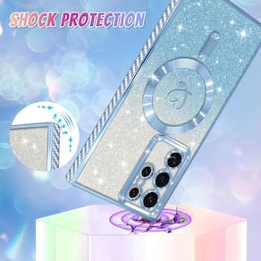 Capa com glitter, suporte magnético para Magsafe, proteção da câmera e design confortável.Acabamento do material