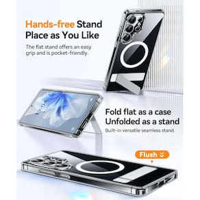 CANSHN Suporte magnético forte e sem costura projetado para Samsung Galaxy S25 Ultra (2025) [proteção total da câmera] [suporte ajustável] [compatível com Magsafe], transparente - Feita apenas para Samsung Galaxy S25 Ultra com tela de 6,8 polegadas. Confirme o modelo do seu telefone antes de fazer o pedido - Levante-se, ligue: (CANSHN MAIS RECENTE PARA 2025 Capa de telefone para Samsung Galaxy S25 Ultra.) O suporte de telefone oferece uma solução tecnológica que combina estética, proteção e conveniência. - Forte conectividade magnética: compatível com carregadores sem fio MagSafe e Qi, esta capa se fixa com segurança a acessórios magnéticos como carteiras e suportes de carro, garantindo uma conexão estável mesmo durante a rotação ou movimento - Transparente e antiamarelamento: feita de TPU e PC de alta qualidade, esta capa mostra a beleza autêntico do seu telefone. O revestimento nano antioxidante resiste a 99,9% do amarelamento causado por raios UV e suor - Resistência superior a quedas: construída a partir de material TPU espesso e à prova de choque, a capa aumenta a resistência a quedas. Cada canto possui almofadas de ar que absorvem impactos para maior proteção