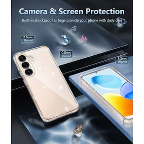 - Proteção de grau militar de 3 metros: aprovado em testes militares de até 3 metros. Esta capa traseira transparente para Galaxy S25 Plus / S24 Plus é feita com policarbonato rígido e amortecedores flexíveis de TPU à prova de choque ao redor da borda e possui 4 airbags de canto integrados para absorver impactos