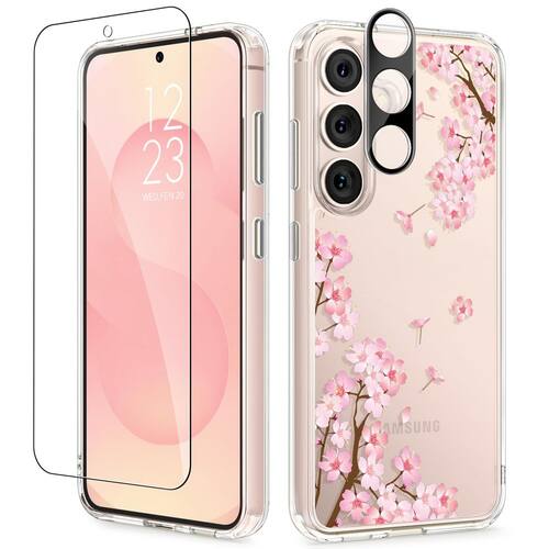 Capa GVIEWIN para Samsung Galaxy S25 Plus com protetor de tela e protetor de lente de câmera, [não amarelada], floral transparente, rígida, à prova de choque, capa de telefone feminina para S25 Plus de 6,7" (Sakura/rosa)
