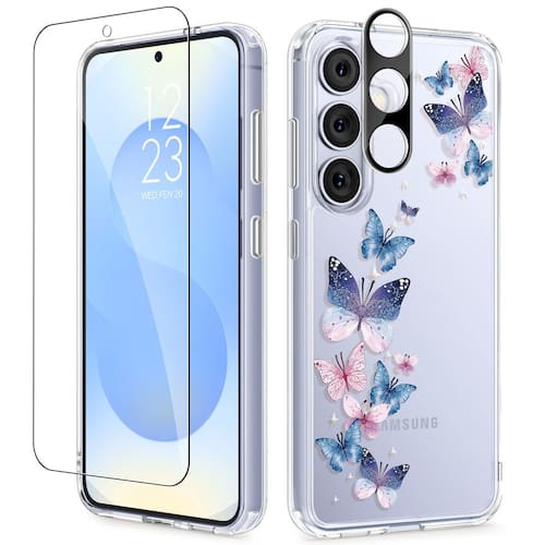 GVIEWIN Capa para Samsung Galaxy S25 Plus com protetor de tela e protetor de lente de câmera, [não amarela] Capa de telefone feminina transparente floral rígida à prova de choque para S25 Plus de 6,7 polegadas (borboleta colorida) - Compatibilidade: esta capa é compatível apenas com Samsung Galaxy S25 Plus (6,7 polegadas, versão 2025); alinhamento preciso permite fácil acesso aos botões, alto-falantes e porta de carregamento; o pacote inclui uma capa floral transparente, 1 película de vidro temperado, 1 protetor de lente; confirme o modelo antes de fazer o pedido (veja a imagem 2) - Padrões florais claros e chiques: a capa apresenta estampas florais elegantes que dão ao seu telefone uma aparência única e atraente; o design transparente mostra a beleza autêntico do seu dispositivo; Criado com tecnologia de impressão avançada, o padrão permanece vibrante e resistente ao desbotamento ao longo do tempo - Proteção de nível militar 3 em 1 de 360°: composta por uma parte traseira rígida de policarbonato e uma moldura de TPU macio, esta capa absorve choques e resiste a quedas de até 3 metros; as molduras elevadas protegem a tela e a lente da câmera de arranhões; inclui um protetor de tela de vidro temperado 9H e um protetor de lente de câmera para fornecer proteção abrangente para o seu telefone - Aderência segura e não amarela: Feita com materiais premium e revestimento antiamarelamento aprimorado, esta capa resiste ao suor, raios UV e manchas que podem manter a clareza durante o uso; seu design fino e leve e borda de TPU macio fornecem uma aderência segura e uso adequado para o bolso - Suporte confiável: suporta carregamento sem fio e é compatível com a maioria dos acessórios de telefone, como suportes de anel e suportes de carro; Para qualquer problema, como incompatibilidade de modelo ou expectativas não atendidas, através do Centro de mensagens da Amazon para assistência imediata