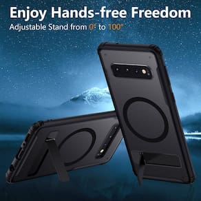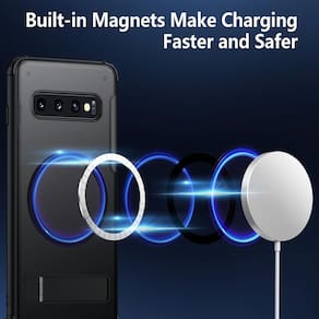 TIANNIUKE Capa magnética para Samsung Galaxy S10 Plus - 1??Compatível com acessórios MagSafe e carregadores sem fio?: Capa magnética projetada para Samsung Galaxy S10 Plus. - 2??Carregador sem fio MagSafe se encaixa perfeitamente?Esta capa fina para Galaxy S10 Plus magsafe suporta todos os acessórios MagSafe, proporciona absorção automática e alinhamento perfeito para o carregamento mais rápido e estável possível. (NÃO inclui acessórios MagSafe) - 3??Um suporte ajustável integrado para suporte em vários ângulos?: É construído com dobradiças de aço de alto carbono para maior durabilidade. Os modos vertical e horizontal flexíveis permitem que você assista confortavelmente a vídeos ou conduza reuniões de negócios. Este suporte pode se misturar em todos os cenários da sua vida. - 4??Proteção contra quedas militar?Capa feita de novos materiais da Alemanha, a parte traseira fosca permanece limpa com um design inteligente de revestimento nano oleofóbico que evita impressões digitais, marcas d'água, óleo e poeira. Boa proteção sem volume, estrutura de ângulo de absorção de impacto projetada para dispersar choques severos. - 5??Proteção de tela e câmera?Design de proteção labial acima da borda da tela e a lacuna da câmera, o que pode impedir que a tela e a lente da câmera entrem em contato diretamente com a área de trabalho, evitando arranhões. - 6??Ajuste perfeito?O design de botão com tudo incluído e recortes precisos permitem fácil acesso a todas as portas e funções, operação sensível. O design de uma peça facilita a instalação e remoção sem passos tediosos.