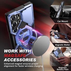 - [Suporte de anel e compatível com Magsafe] A capa Samsung S25 Ultra possui um suporte de anel embutido que funciona como um ímã. Sua forte conexão magnética se conecta com segurança aos acessórios MagSafe, como carregador magnético, carteira, bateria, suporte para carro, etc. Como suporte, a capa s25 ultra mantém seu telefone na posição vertical ou lateral, perfeita para conversas por FaceTime ou vídeo sem usar as mãos
