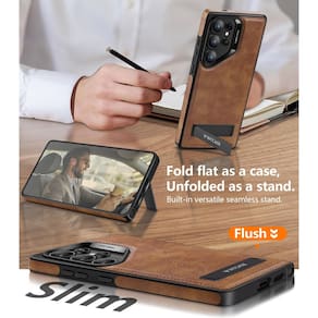 Capa fina e leve com design empresarial e elegante, compatível com Samsung Galaxy S25 Ultra (2025). Possui suporte invisível ajustável entre 40°~120°, compatível com acessórios MagSafe, feita de couro PU premium com moldura de TPU antiderrapante e botões sensíveis. Bordas elevadas protegem a tela e a câmera contra arranhões e pequenas quedas.Características