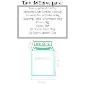 tamanho:p brastemp clean 5, 6, 7 ou 8kg brastemp eletrônica 5kg brastemp eletrônica compacta 5kg brastemp total 9kg brastemp mondial 4 ou 5kg brastemp advantech wash 5kg consul 5kg consul mare 7,5kg consul super jato 6kg electrolux turbo econômica 6, 8 ou 9 kg electrolux turbo rápido 10kg electrolux turbo limpeza 8kg muller diva 5kg