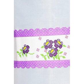 Capa confeccionada com tecido tergal na cor branco, com um barrado bordado em ponto cruz, com rosas e folhas em tons de lilás, amarelo e verde e detalhes em laise na cor lilás de bolinha.