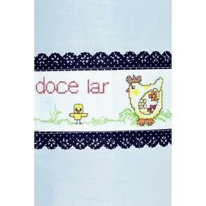 Capa confeccionada com tecido tergal, na cor branca, barrado bordado em ponto cruz e detalhe no meio de uma encantadora galinha e seus pintinhos em amarelo, vermelho, laranja e verde e acabamento em lese preta com bolinhas brancas.