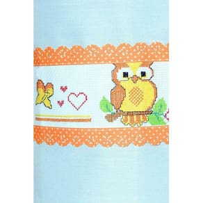 Capa confeccionada com tecido tergal na cor branco, com barrado bordado em ponto cruz de uma linda corujinha, nas cores laranja, vermelho, preto, amarelo e marrom, acabamento em laise laranja de bolinhas branca.