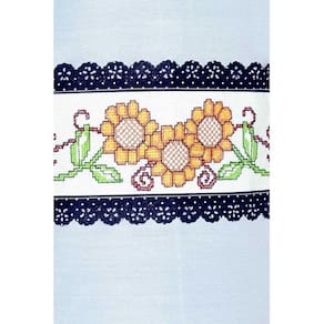 Capa confeccionada com tecido tergal na cor palha, com girassóis bordados no barrado em ponto cruz nas cores amarela, verde e vermelha, detalhes em laise na cor preta com bolinhas brancas.
