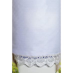 Capa para galão de água confeccionada com tecido oxford liso, 100% poliéster, na cor branca, detalhes no acabamento em guipir na cor branco.