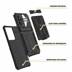 A Capa Guardian da Gorila Shield para Samsung Galaxy A73 5G, foi desenvolvida para proteger seu aparelho, com a mais alta tecnologia de absorção de impactos, garantindo extrema segurança. Fabricado com um design leve e fino, mas sem perder a segurança de proteção para seu celular. A Capa Guardian tem um encaixe perfeito para adaptar-se totalmente ao seu aparelho, deixando os botões livres. Possui uma alça Kickstand, que permite utilizar o celular apoiado na horizontal. Além disso, a capa Guardian oferece um compartimento exclusivo para guardar seus cartões. Confira seu modelo antes de finalizar a compra