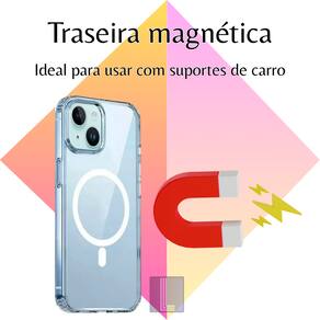 -- PRINCIPAIS VANTAGENS -- Ímãs de Alta Potência: Sistema de ímãs superfortes integrados que garantem uma fixação segura e estável em suportes de carro, carregadores Mag-Safe e muito mais. Não solta fácil! Proteção Anti-Impacto: Absorve choques e protege contra quedas acidentais. Material: Policarbonato (PC) + TPU de alta resistência. Proteção e conforto: Bordas elevadas protegem a tela e a câmera quando o aparelho está apoiado em superfícies planas, evitando riscos. Os botões fornecem um toque macio ao serem pressionados. Tecnologia Magnética: Compatível com Mag-Safe e acessórios magnéticos padrão. Película de proteção 3D: Protege a tela contra arranhões