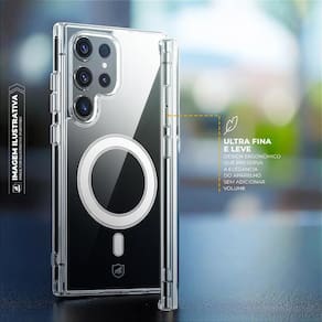 A Capa MagSafe Transparente para Samsung Galaxy S25 Ultra, da Gshield, foi projetada para dar mais segurança ao seu smartphone. Com imãs em anel integrados e alinhados perfeitamente com seu aparelho oferece um encaixe mais rápido e fácil na recarga sem fio, podendo manter a capa em seu aparelho durante o carregamento magsafe.