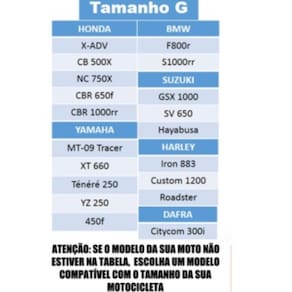 Capa para cobrir motocicleta 100% impermeável e com forro, protege contra sol, chuva , poeira, risco e sujeira de animais ou aves. Ideal para quem quer conservar a pintura da sua moto. Nas borda da capa possui elásticos que deixa a capa bem presa a moto. Fabricada com material de alta qualidade que oferece maior resistência e durabilidade, impede qualquer tipo de dano na pintura. Para escolher o tamanho ideal para sua moto, siga a tabela de medidas que se encontra nas fotos do anúncio.