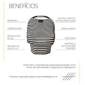 Capa Multifuncional Stripes Felix - Penka A Capa multifuncional Penka Cover foi desenvolvida para ser utilizada como um acessório versátil que facilita o dia-a-dia dos pais e a proteção do seu bebê. Moderna, funcional e fácil de usar pode ser utilizada desde o nascimento até aproximadamente os 3 anos de idade: Pode ser utilizada como capa interna ou externa para o bebê conforto, carrinho de bebê, moisés e utilitários. Também como capa de amamentação com 4 aplicações distintas, protetor para o carrinho de supermercado, cadeirão de alimentação de restaurantes, para cobrir o bebê e até mesmo como uma simples gola ou cachecol para a mãe; protege a criança contra luz solar excessiva, vento, sujeira e até mesmo de espectadores indesejados; oferece cobertura ajustável de até 360 graus tanto quando utilizada no bebê conforto quanto como capa de amamentação, garantindo total privacidade e tranquilidade; feita com matérias prima de excelente qualidade, proporcionando durabilidade, conforto e segurança com a ideal circulação de ar; sua elasticidade permite um ajuste personalizado para qualquer bebê conforto ou utilitário, e proporciona conforto enquanto utilizada como capa de amamentação; Características: Composição: 93% viscose, 7% elastano; Modelo: Felix; Cor: Preto e Branco; Contém: 01 capa; Idade Recomendada: do nascimento até 2 anos; Marca: Penka Público-alvo por gênero: Masculino Tamanho: Único Dimensões do produto: 20 x 20 x 10 cm ; 299 g Imagens meramente ilustrativas Ean: 7897072197508