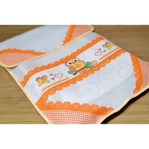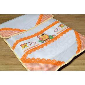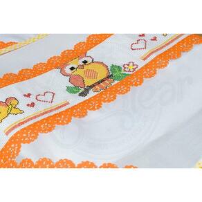 Capa em tecido tergal na cor branco, com barrado bordado em ponto cruz de uma linda corujinha, nas cores laranja, vermelho, preto, amarelo e marrom, acabamento em laise laranja de bolinhas branca.
